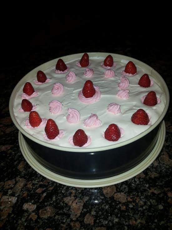 Kad se ohladi, dodamo na vrh torte pravi,mliječni šlag (Veronika,Vindija,Brzo i fino). Ukrasimo voćem, kokosom.Torta nestaje u trenu ! Prefina,jednostavna proljetna slastica. Probajte !