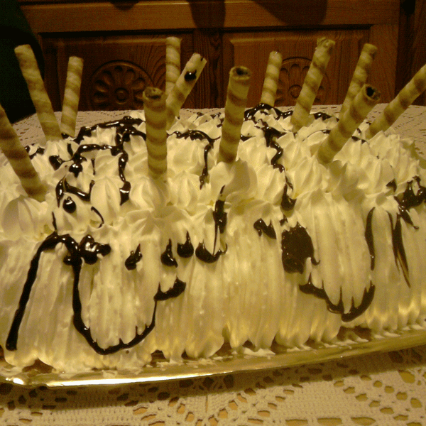Ispečenim i ohlađenim korama uklonimo papir za pečenje .Na podlogu za torte od smjese za osnovu oblikujemo formu kao roladu. Premažemo formu kremom. Na kremu stavimo bijelu koru, prilijepimo je i odrežemo suvišan dio. I koru premažemo kremom i na kremu stavimo smeđu koru, prilijepimo i odrežemo suvišan dio i premažemo kremom.