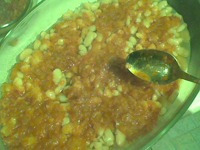 Ako sami kuhate grah, kuhajte ga samo u jednoj vodi, tako da sav škrob ostane u njoj, inače trebate da bi zgusnuli napraviti zapršku. Ja je izbjegavam gdje mogu, jer teško sjeda na želudac. Umješajte grah te maknite sa štednjaka.Presipajte u posudu za pečenje, najbolje su one glinene, ali i keramičke nisu loše.