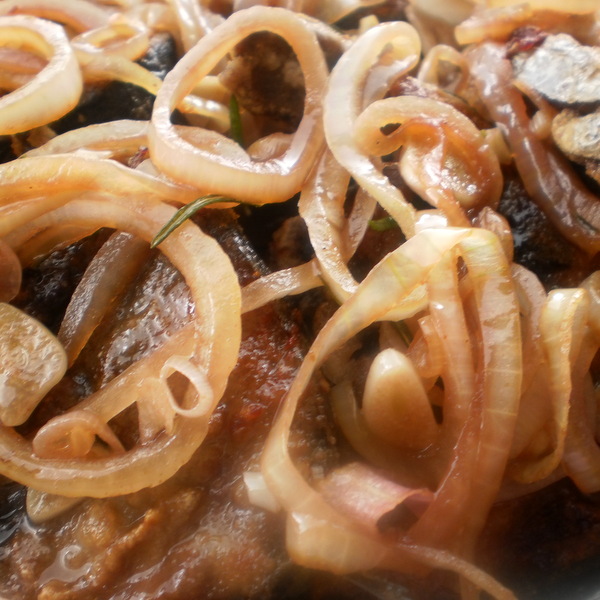 - Kad svu ribu ispržite,smanjite vatru i stavite na ulje grančicu ružmarina,odmah zatim narezani luk,